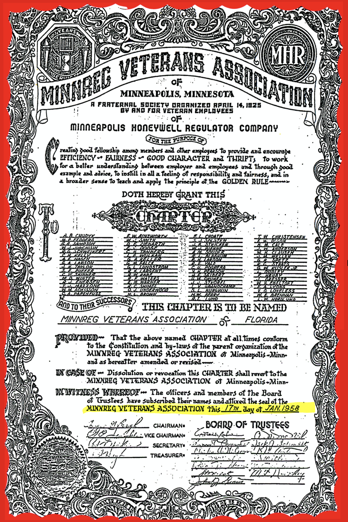 A fraternal society organized April 14, 1925 by and for veteran employees of Minneapolis Honeywell Regulator Company for the purpose of creating good fellowship among members and other employees to provide and encourage efficiency, fairness, good character and thrift. To work for a better understanding between employer and employees and through good example and advice, to instill in all a feeling of responsibility and fairness, and in a broader sense to teach and apply the principle of the Golden Rule.